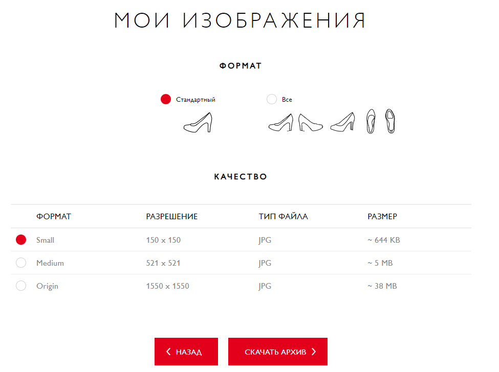 Реализован функционал, который предоставляет возможность клиенту на основе его заказов скачать изображения товаров, как основные изображения, так и полный пакет картинок товара с выбором размера изображений. Генерируется архив с папочной архитектурой (бренд->сезон) и отдается на скачивание.