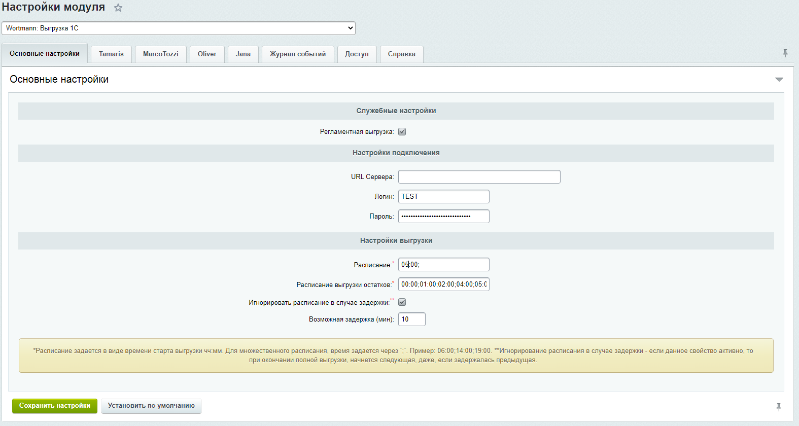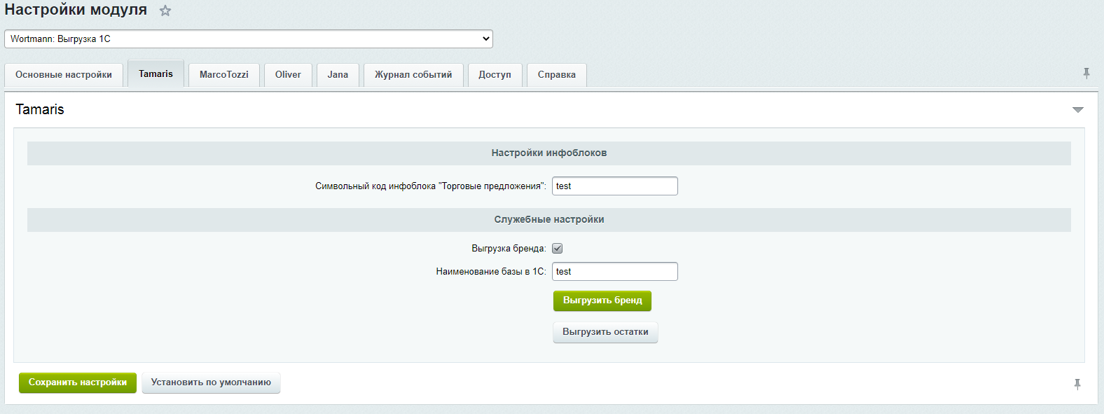 Как ранее сказано, модуль также имеет возможность ручной выгрузки каждого из брендов, корректировки данных для авторизации и изменения наименования баз.