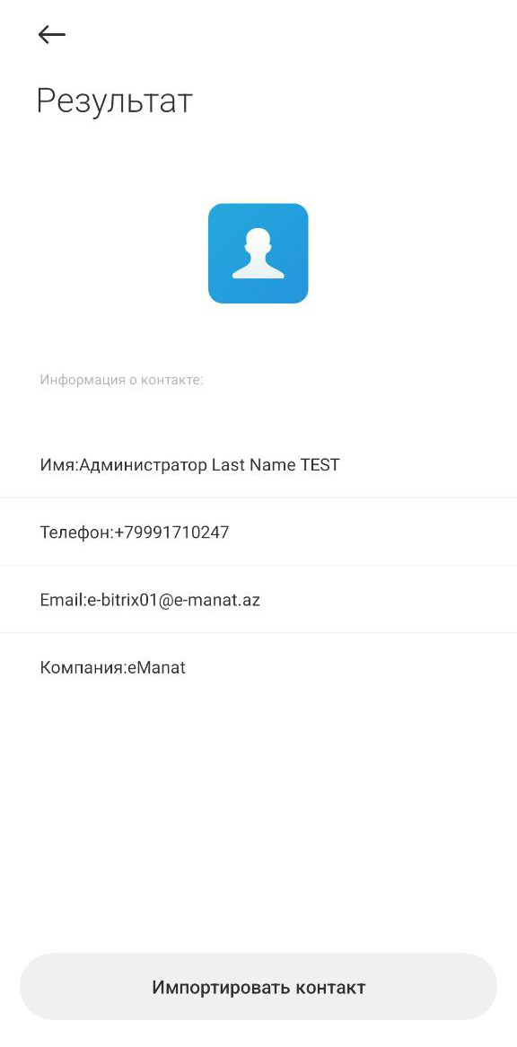 В карточках сотрудников (профиль) при вводе контактных данных (ФИО, почта, телефон мобильный, телефон рабочий, компания, отдел) генерируется QR-код, который позволяет создать в мобильном устройстве карточку сотрудника в формате V-Card. При изменении данных код моментально автоматически перегенерируется.